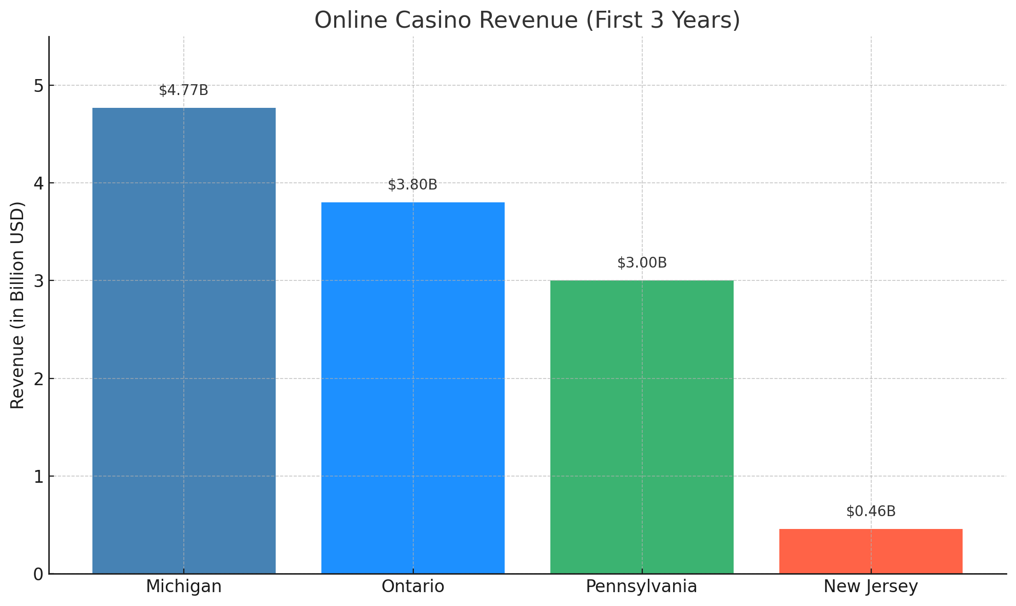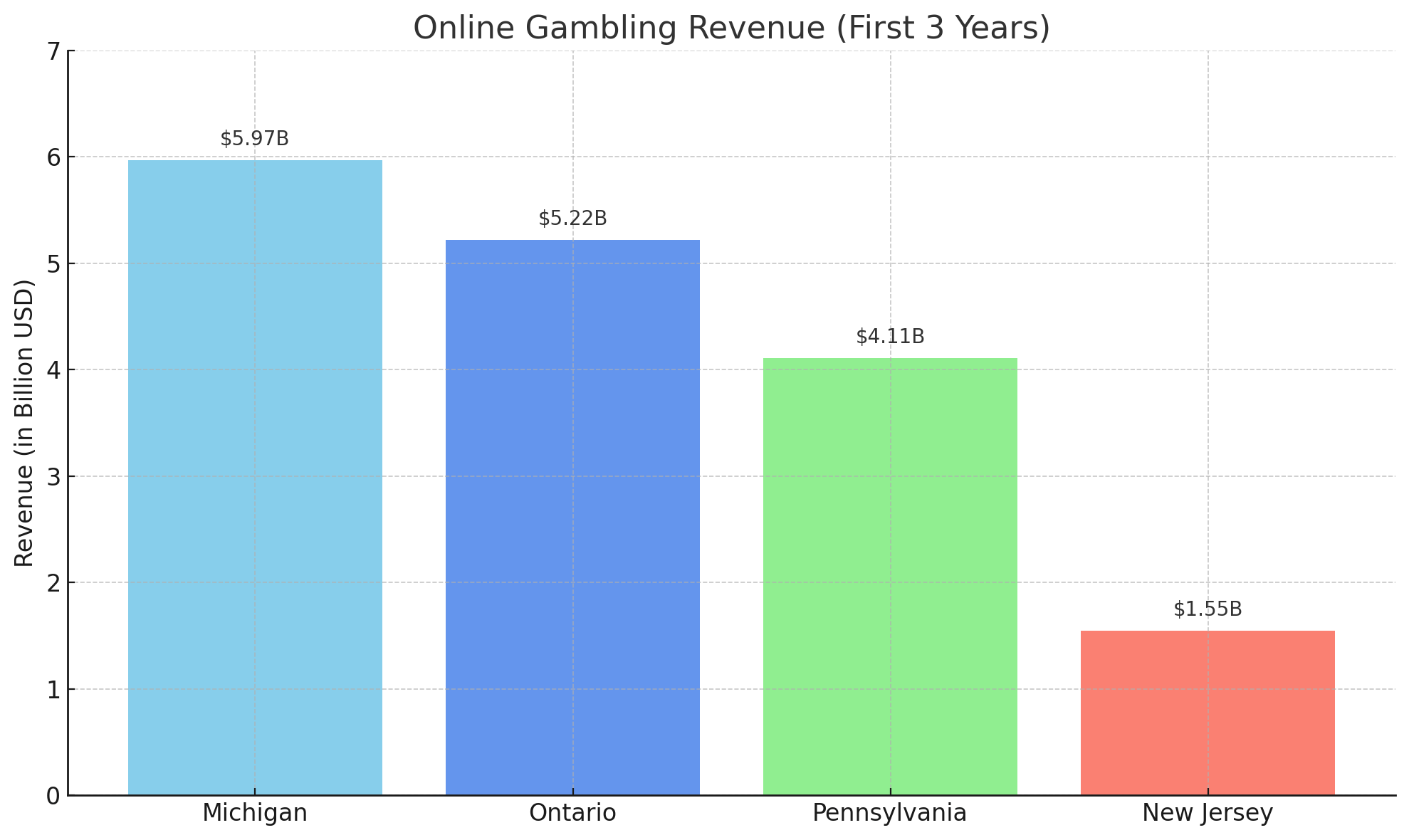 Ontario's performance is impressive compared to U.S. states with similar open online gambling markets. Michigan leads with nearly $6 billion, followed by Ontario and Pennsylvania, which has about $4.1 billion in revenue.