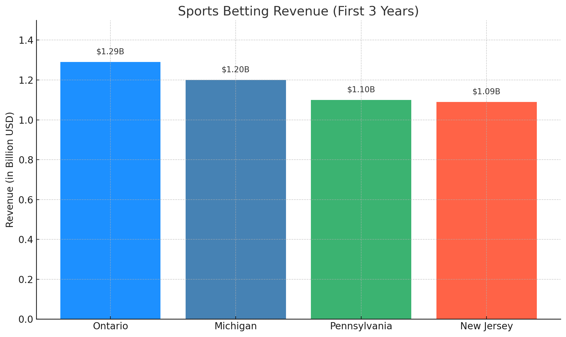 Ontario surpasses Michigan, Pennsylvania, and New Jersey in sports betting, ranking first with $1.29 billion.