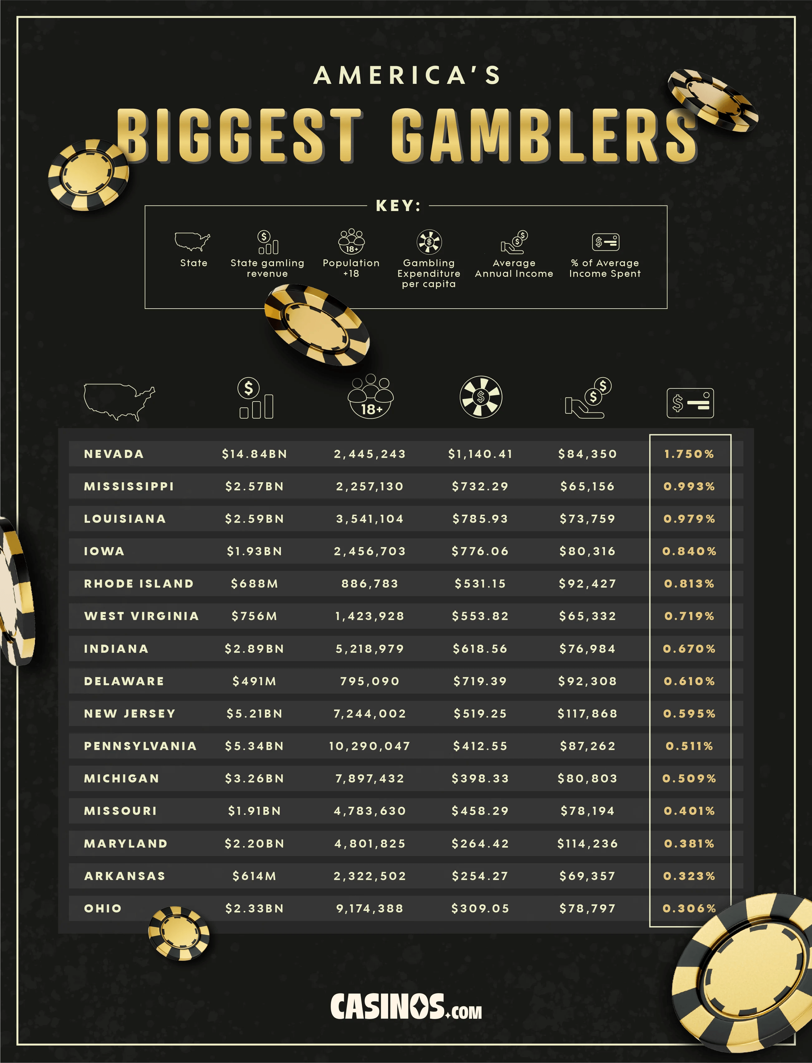 Nevada has a relatively small adult population compared to the other areas in our ranking, but a much higher gambling expenditure per capita of $1,140. Combined with their above-average annual income, that means that each year, Nevada inhabitants spent the highest percentage of their average income on gambling – 1.75%, which might not sound like a lot until you realize that the next highest was under 1%! There's little doubt that Las Vegas casinos will always be popular.