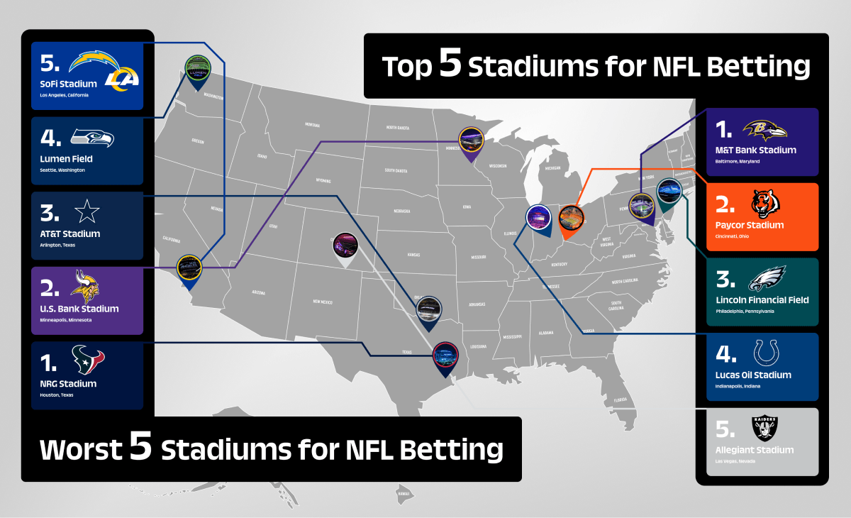 The second-worst fan-betting experience belongs to the Minnesota Vikings and U.S. Bank Stadium, which just marginally beat out the Texans with an index score of 15. All of the same issues plaguing Texans betting fans afflict Vikings fans, too, but the Purple and Gold can at least boast a higher win percentage of 53.3%, meaning at least the Vikes fans who CAN bet on their home team during games have a better chance of seeing some returns.
